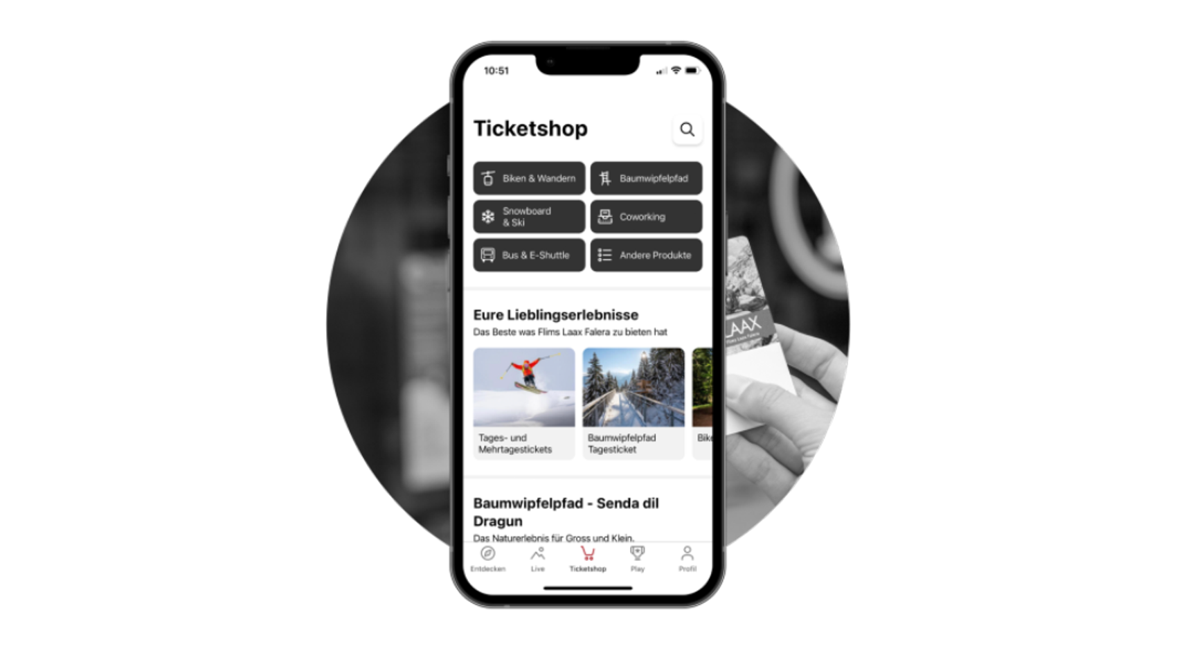 The SHOP is more diverse, personalized, and appealing, with new products, from tickets to merchandise. We have placed special focus on configuring your lift tickets and keycards for LAAX, making this complex process a bit more pleasant and easier. Now you can also search for products in the SHOP – whether it's reward products or Blueline upgrade, if it is bookable in the app you can search for it. Our tip: check the SHOP from time to time and get inspired.